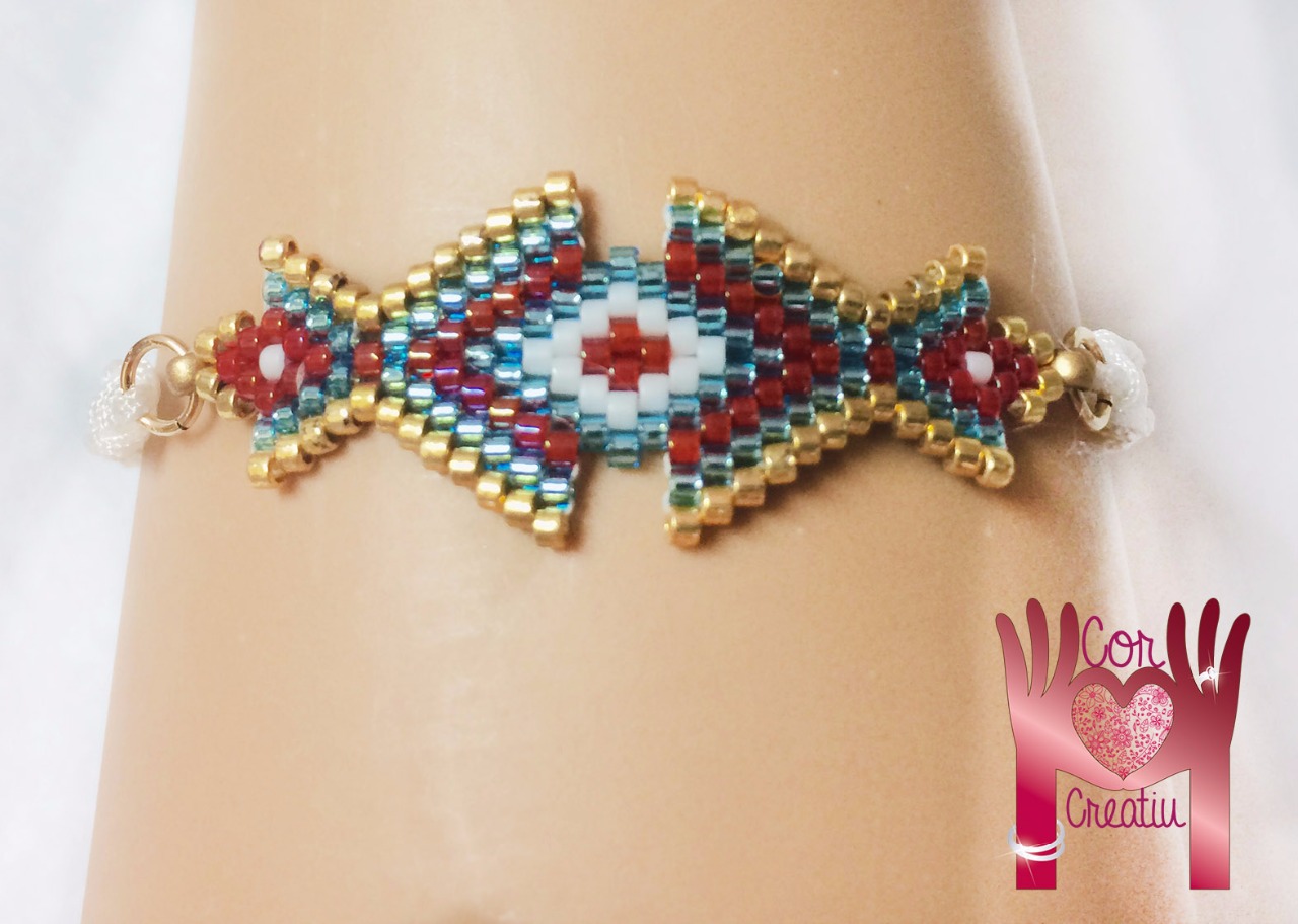 Pulsera de macramé con entrepieza de cristal japonés elaborada pieza a pieza, terminales en baño de plata dorados.